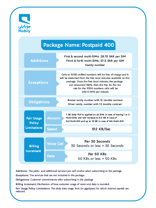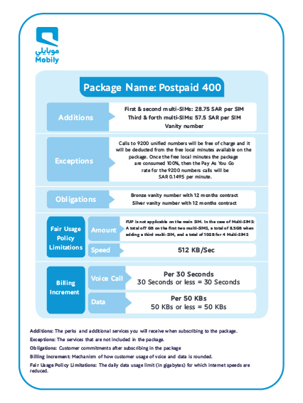- Deaf & Mute customers are eligible for 50% discount on the package monthly fee as ongoing feature and required to provide proof letter from Ministry of Human Resources and Social Development at Mobily outlets.